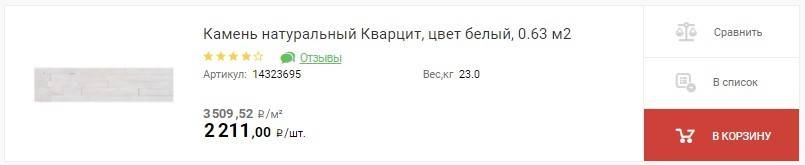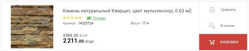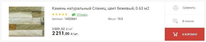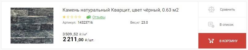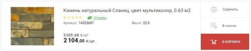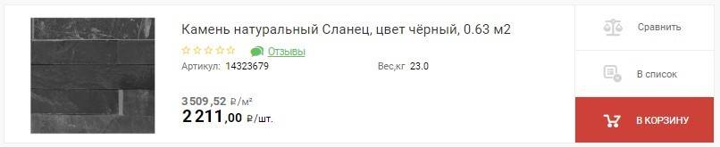 Также из натуральных камней можно приобрести Кварцит в черном цвете и мультиколор (м.кв. материала обойдется 3510 рублей, вес одной упаковки – 23 кг), Сланец (стоимость м.кв. – 3340 рублей, вес упаковки – 23 кг).