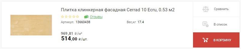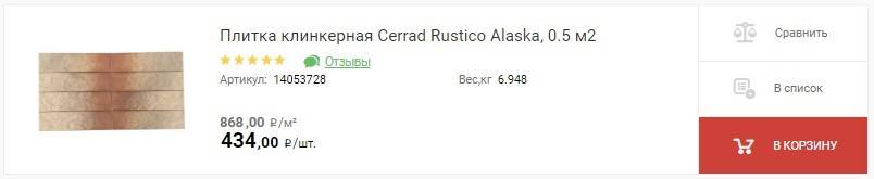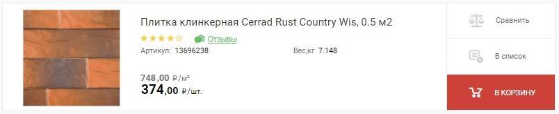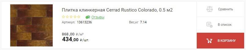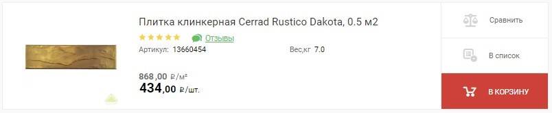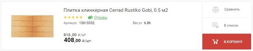 Также в Леруа Мерлен можно приобрести клинкерную плитку марки Cerrad Rustico Colorado (площадь одной пластины – 50 см.кв., стоимость м.кв. изделия – 870 рублей), Cerrad Rustiko Gobi (м.кв. обойдется 820 рублей, вес одной упаковки – почти 7 кг), Cerrad Rustico Dakota (вес упаковки – 7,2 кг, стоимость одного м.кв. – 870 рублей) и другие варианты.