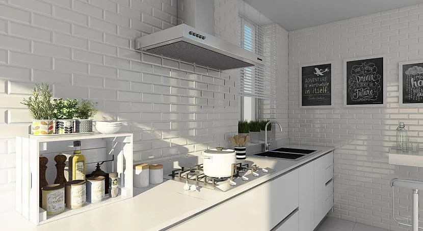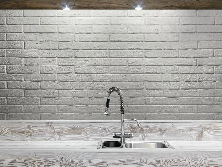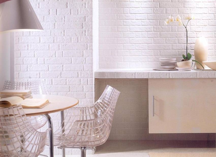 Облицовка белого цвета под кирпич на кухнеИсточник www.xplit.ru