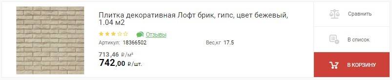 В каталоге Леруа Мерлен ценовая политика на декоративный кирпич указан как за м.кв. материала, так и за одну пластину кирпича. В зависимости от типа материала и его параметров один кирпич может обойтись от 280 рублей. Самый дорогой набор плитки (упаковка) обойдется 4800 рублей.