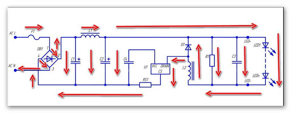 Достоинством этой схемы драйвера является простота, позволяющая поместить его даже в цоколь Е14, высокий КПД и практически отсутствие выделения тепла. Недостатком является большой коэффициент пульсаций светового потока, что исключает использование ламп с таким драйвером для освещения рабочих мест с напряженным трудом.