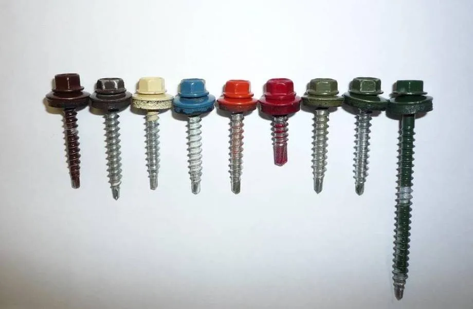 Крепежные изделия для кровельных материалов изготавливаются из легированной нержавеющей стали. Шляпки и шайбы в большинстве своем окрашиваются порошковыми составами. Цвета производители выбирают из той же матрицы, что и для металлочерепицы.