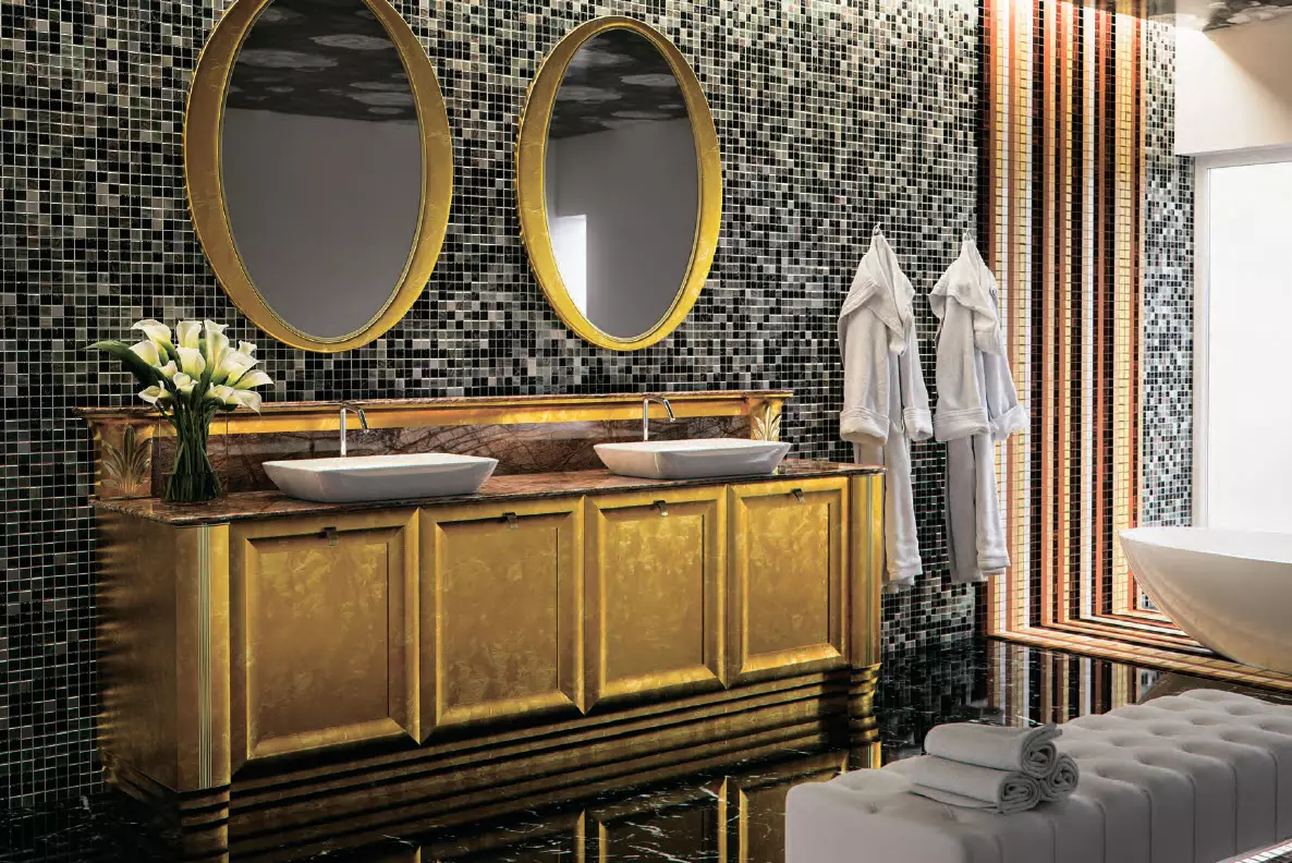 Используйте зеркала, перламутровую плитку, ажурные орнаменты, серебряные или перламутровые цвета. Отлично смотрится классическая ванна на гнутых ножках и зеркало в массивной декоративной раме в сочетании с более лаконичной и минималистичной мебелью.
