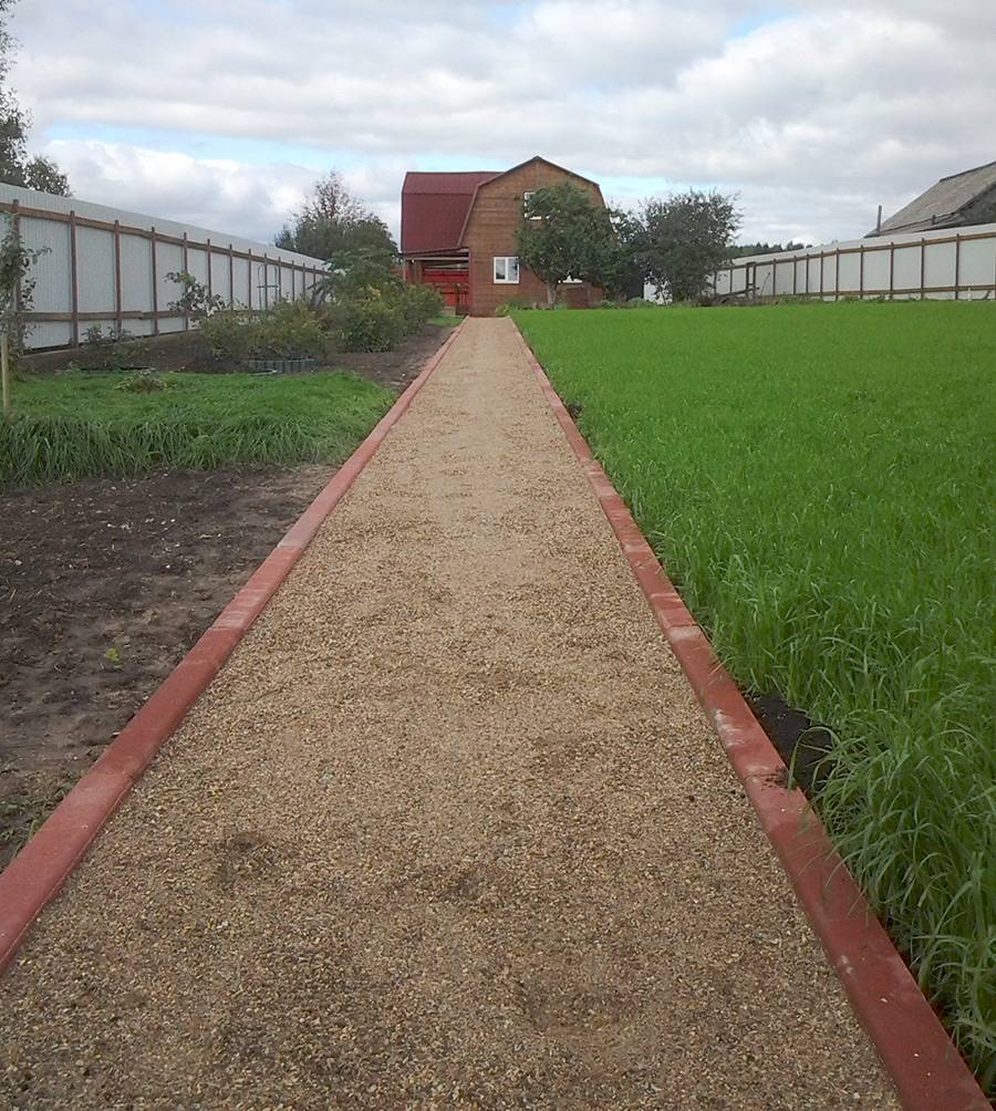 Чтобы гравий не выходил за грани дорожки, обязательно устанавливается бордюр, который будет служить в качестве ограничителя. Можно использовать: