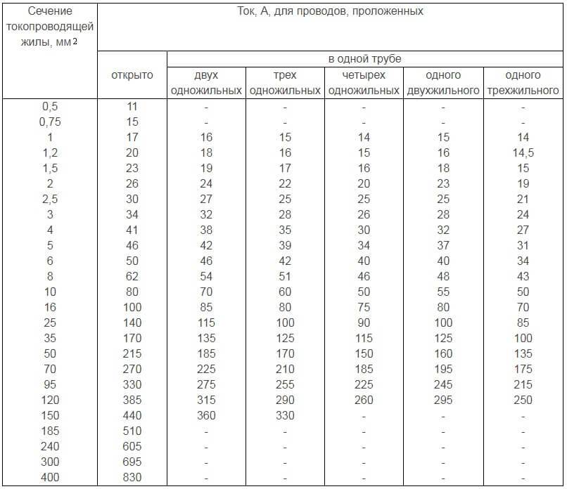 Допустимый длительный ток для проводов и шнуров с резиновой и поливинилхлоридной изоляцией с медными жилами