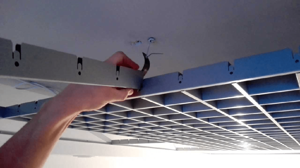 К потолку каркас монтируется на специальных подвесах. Все профили к подвесам закрепляются с помощью обычных шурупов. Когда основа собрана, то можно приступать к монтажу внешнего покрытия — листов оцинкованной стали. В заводском варианте они могут просто вставляться в ячейки каркаса или крепиться дополнительно с помощью специальных защёлок.