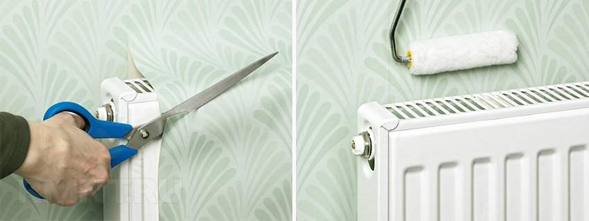 Для разравнивания обоев за радиатором используют тряпку либо картонный рулон. Перед поклейкой с розеток и выключателей снимают крышки. На готовом полотне посередине отверстия делают надрез крест-накрест, края отодвигаются в стороны. Крышки и выключатели одевают на место.