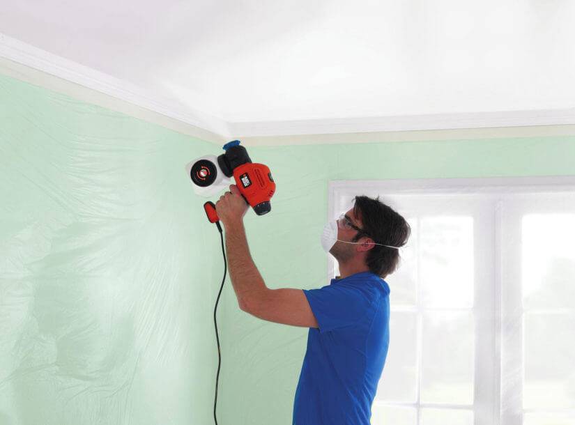 Применение краскопульта — хороший способ сократить затраты по силам и времени. С его помощью покрасить потолок водоэмульсионной краской своими руками можно значительно быстрее, но при неумелом использовании так же можно и загубить работу. Чтобы избежать ошибок при работе с краскопультом, руководствуйтесь следующей инструкцией: