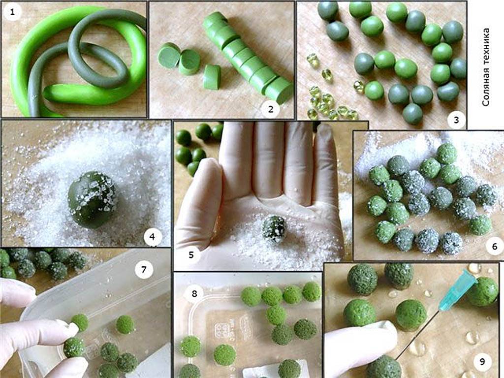 Нередко поверхность изделий из пластики требуется шероховатая, напр., чтобы цветы и листья из нее выглядели натуральнее, как на рис. справа. Также шероховатость поверхности, но более мелкая, нужна под лакировку бижутерии, чтобы лак держался. Того и другого добиваются т. наз. соляной техникой, см. рис. ниже. Изделие подсушивают, как описано выше, обваливают в кухонной соли (она удобна хорошей растворимостью в воде и тем, что выпускается разного помола), затем выдерживают в воде, пока соль не растворится. Если делаются бусы, отверстия в них сверлят тут же, а прочие изделия досушивают, как надо.