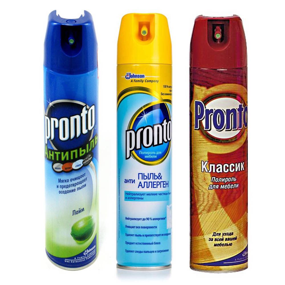- «Пронто» — отлично удаляет пятна, восстанавливает исходный внешний вид, придает естественный блеск. Идеально подходит для лакированной мебели. Содержит силикон, антистатик. Благодаря последнему не позволяет пыли оседать на поверхности. Применим для изделий из пластика, гранита.