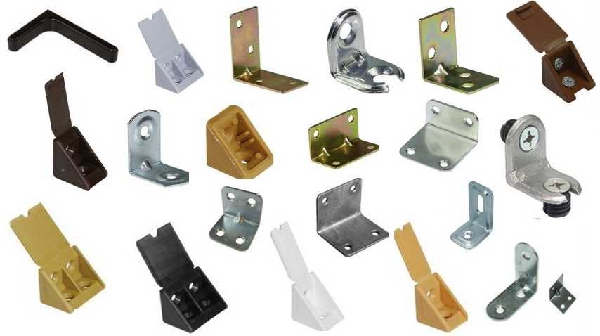 Уголки устанавливают снизу по два на каждое соединение с права и слева. Делают их из металла или пластмассы. Если нагрузка планируется значительная, ставьте металл, если полки декоративные — можно мебельные из пластика.