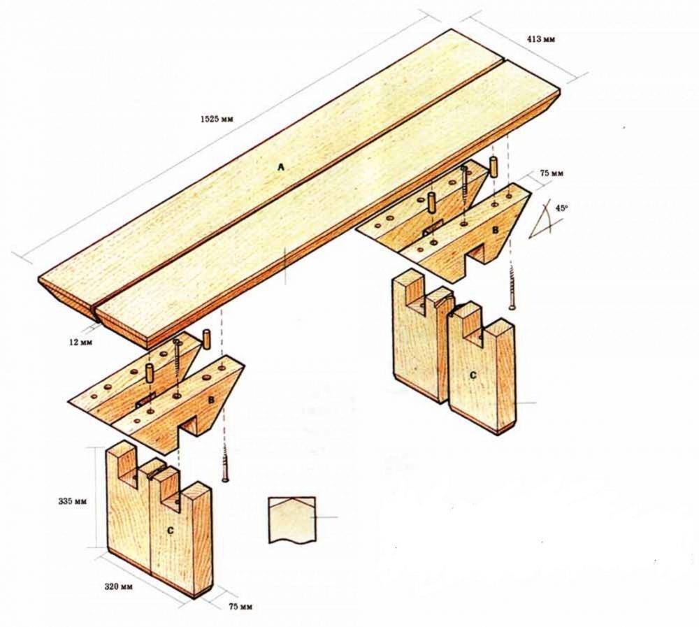 Конструкция лавки простая. Выполняя указания пошагового руководства, несложно сделать полок своими руками даже новичку.