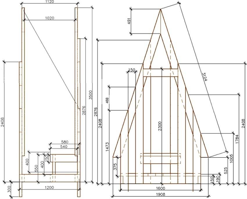 Отхожее место в виде шалаша очень легко построить. Это двускатная постройка, напоминающая по форме вигвам. Такой чертеж дачного туалета из дерева с размерами позволяет сэкономить стройматериалы и время, требуемое для возведения.
