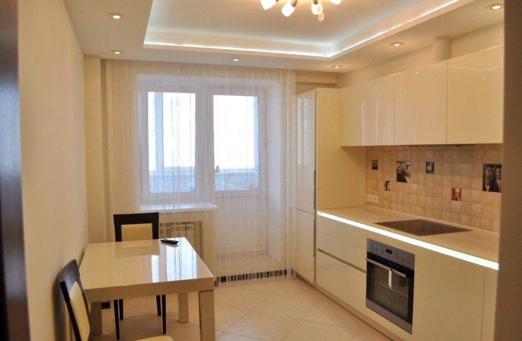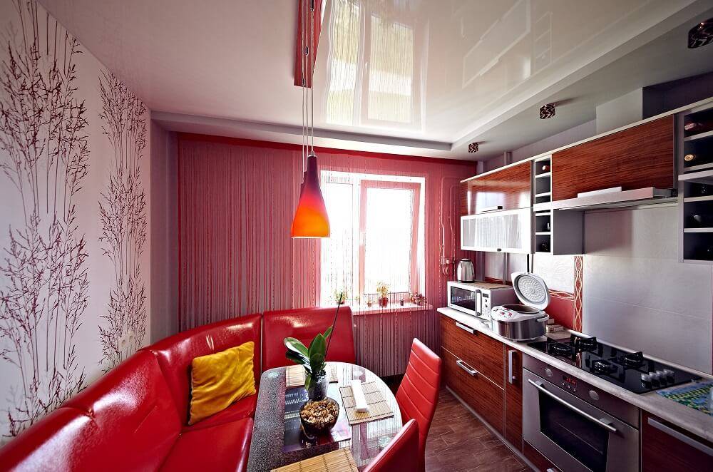 Сочетание глянцевого натяжного потолка с дизайном кухни