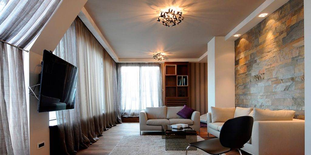 Для некоторых типов помещений отлично подходят многоуровневые потолки. Их также делают с использованием навесного оборудования с пленкой либо тканью. Особенно актуальны такие решения для современных стилей минимализм и лофт. За счет удачно подобранной двухуровневой конструкции, а также при установке качественного освещения, можно успешно зонировать пространство без лишних затрат.