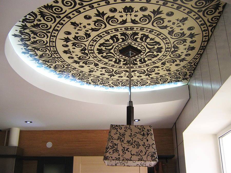 Тканевые либо пленочные натяжные потолки можно заказать с нужной фотопечатью. Современные производители предлагают множество уже готовых вариантов, но также можно выбрать и свою собственную картинку, которую напечатают на специальном оборудовании.