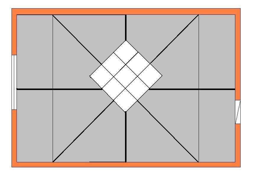 - Давайте разметим потолок. Плитка удобней всего клеится по диагонали или параллельно стенам, как мы уже упоминали выше;