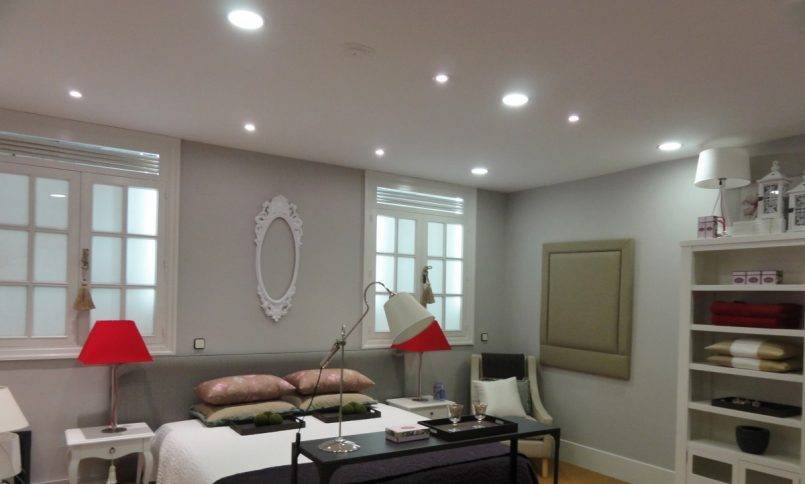 Их же часто используют для организации освещения комнаты, где смонтирован натяжной потолок. Но в этом случае точечный потолочный светильник устанавливается и закрепляется на специально подготовленную конструкцию, которая закреплена на базовой потолочной поверхности. Это делается с одной единственной целью – чтобы избежать провисания натянутого полотна.
