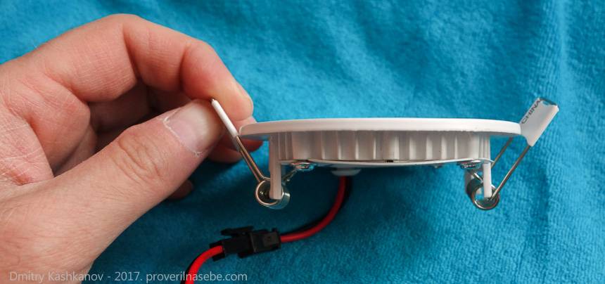 Чаще всего эти светильники устанавливаются в подвесные потолочные конструкции (гипсокартонные, реечные, панельные и так далее). При этом сам прибор врезается прямо в обшивку и закрепляется на ней специальными подпружиненными усиками, которые распирают монтажную конструкцию вдоль плоскости потолка.