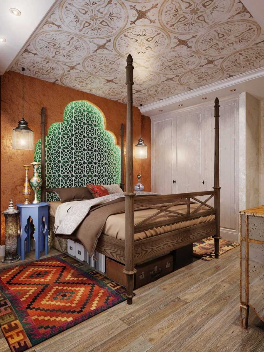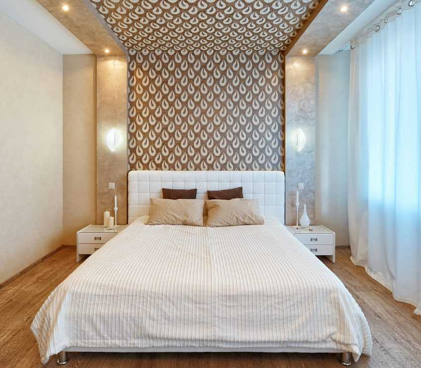 Если форма комнаты правильная, то вполне достаточно будет одноярусного натяжного потолка, для комплектации которого могут быть использованы встроенные светильники, выделяющие зону кровати. В случае ее установки рядом с окном, от светильников можно отказаться, заменив их расположенной посреди потолка люстрой. А вот зональное освещение в таком случае будет осуществляться при помощи расположенных у кровати бра.