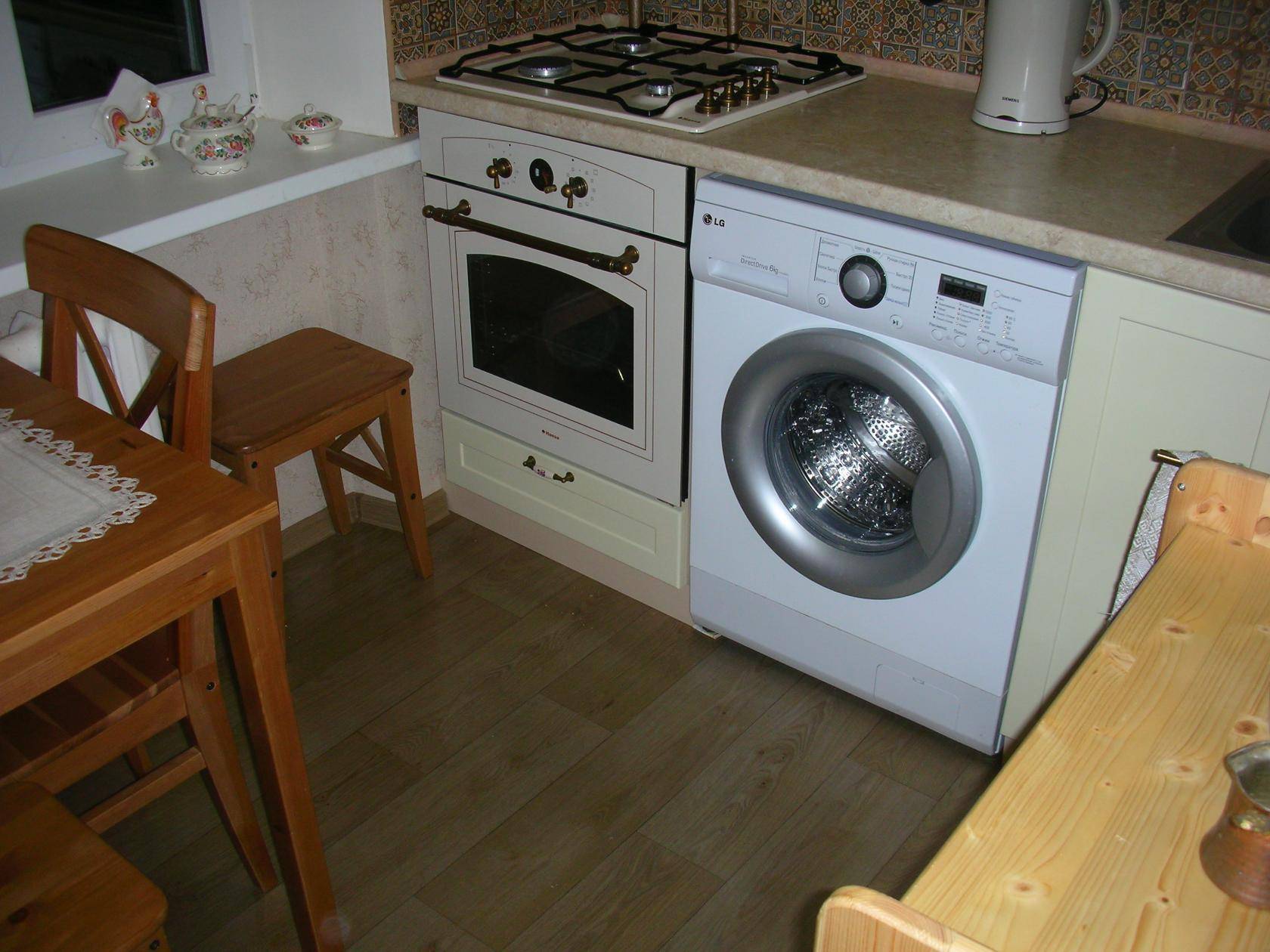 Стиральную и посудомоечную машины тоже достаточно часто устанавливают на кухне. По правилам расположения не рекомендуется их ставить рядом с плитой, поскольку, несмотря на наличие защитного термоизоляционного слоя, нагрев все равно может негативно действовать на работу прибора.