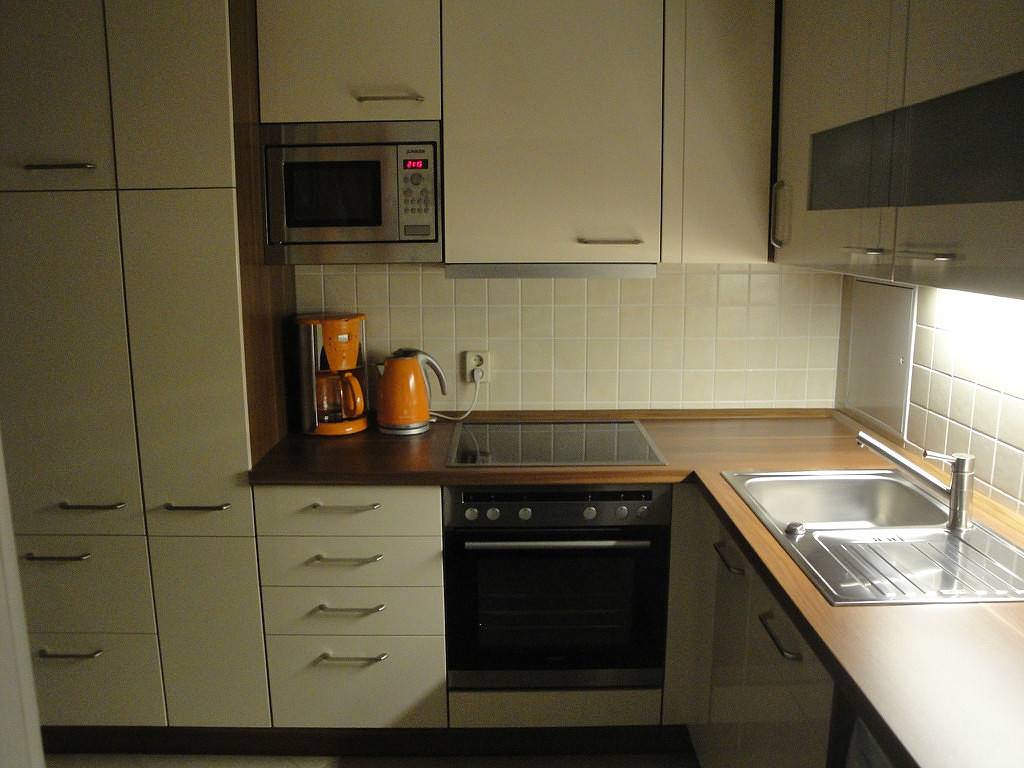 - Важный элемент – холодильник. Его принято ставить недалеко (не далее двух метров) от мойки или встраивать в блок рядом с микроволновкой и духовкой.