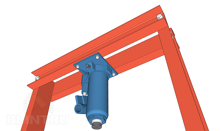 В нашем случае домкрат просто крепится в перевёрнутом положении к центру верхней балки. Здесь не нужно массивных болтов, достаточно проделать в опорной пластине домкрата пару отверстий и обеспечить фиксацию болтами М10 или М8, способными выдержать вес самого домкрата и незначительное усилие сдвига на начальном этапе сжатия.