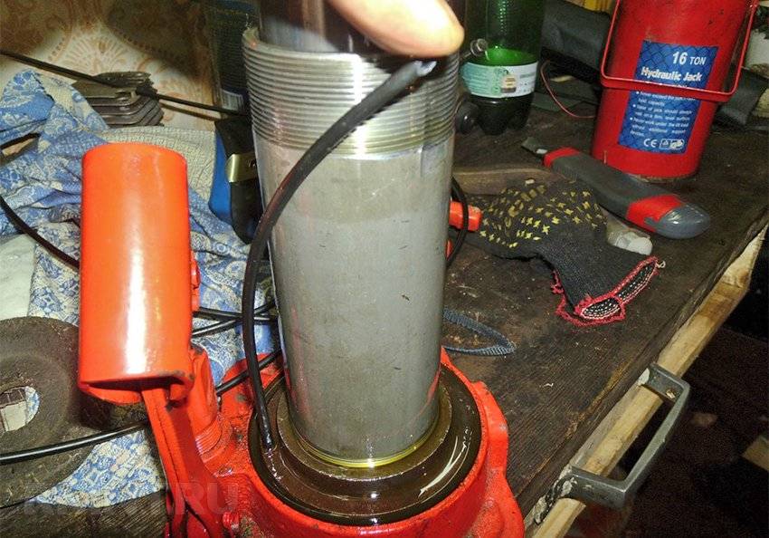 Другой вариант переделки потребует разборки домкрата. Необходимо полностью слить масло и прокачать плунжер, затем скрутить верхнюю прижимную гайку, зажав её в тисках. После этого резиновой киянкой расшатывается внешний стакан, он должен выйти из посадочного кольца в основании домкрата.