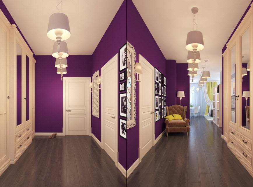 Светлые тона визуально расширяют комнату, поэтому покраска стен или украшение их яркими элементами будет выигрышно смотреться в узких коридорах. Дизайн холла должен соответствовать общему дизайну квартиры. Для красоты и удобства можно поставить кресло, журнальный столик или вазу.