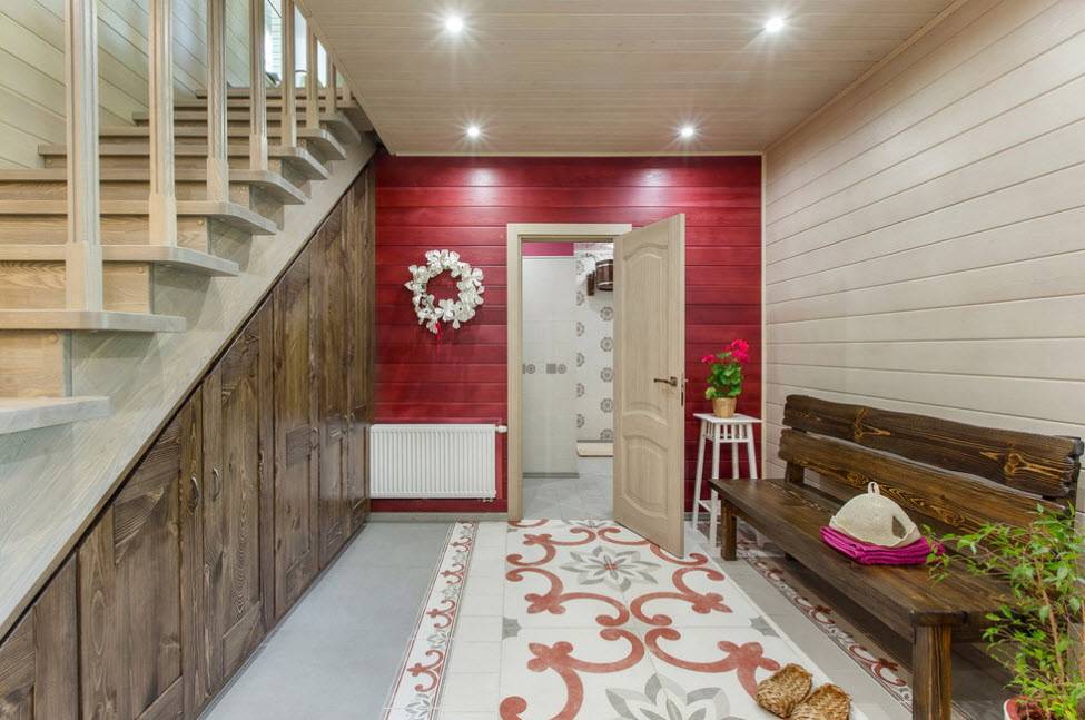 Функциональным решением будет установка шкафов для верхней одежды, полок для обуви и головных уборов. Сочетание разных видов освещения и отделочных материалов поможет зонировать помещение.