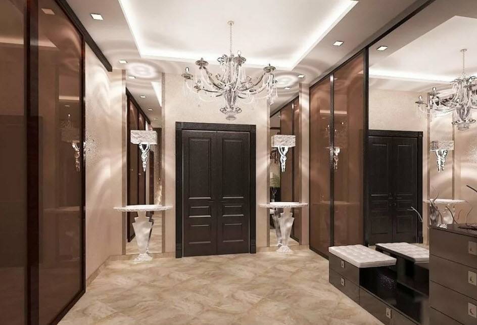 Прихожую можно украсить красивым шкафом-купе с большим зеркалом и многоуровневой подсветкой. Зону отдыха дополнит мягкая мебель, журнальный столик, предметы декора: статуэтки, вазы, часы или декоративные растения. Эту зону можно оформить в стиле ретро с помощью комода, картин, светильников под старину. Разделение коридора на две части можно выполнить с помощью арки, разных типов полов.