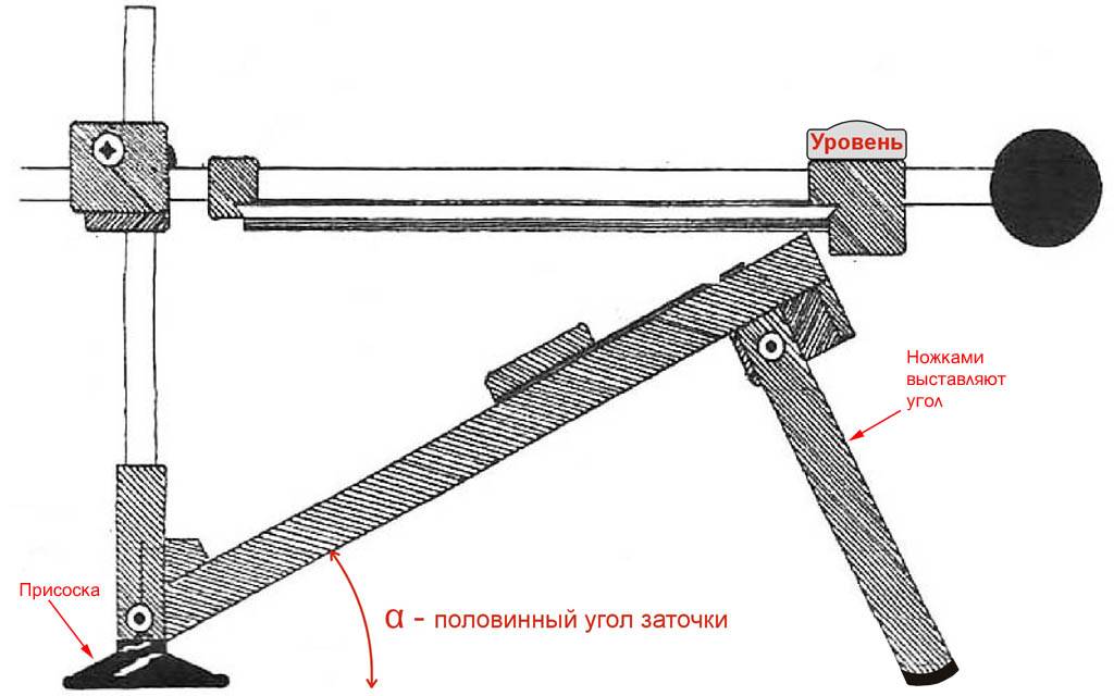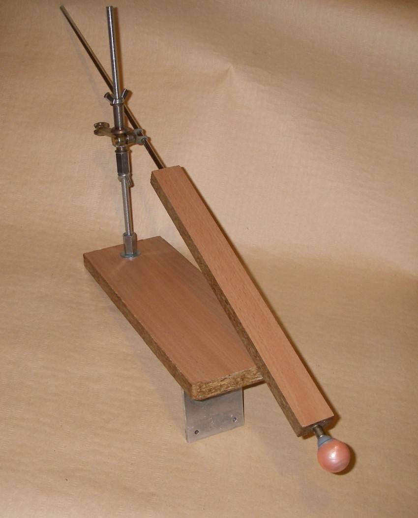 Устройство представляет собой опорный стол, на котором закрепляется нож. На противоположном конце стола вертикально закреплена винтовая стойка с планкой. В эту планку вставляется направляющий стержень, на котором монтируется абразивный брусок. Методом передвижения планки по винтовому стержню можно изменить величину угла обработки металла.