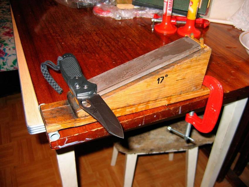 Оптимальный угол заточки кромки ножа составляет от 20 до 30 градусов, в зависимости от функционального предназначения инструмента. Производить ручную заточку под этим углом довольно сложно, поэтому для такой цели применяют простые самодельные механизмы.