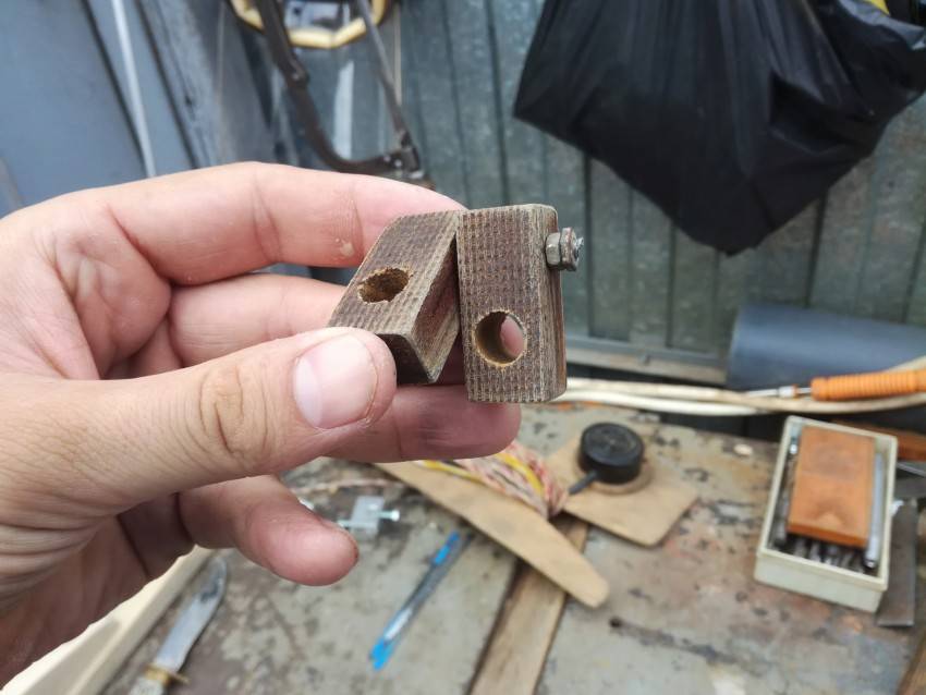 После этого приступаем к изготовлению рычага, который позволит закрепить наждак на приспособлении. Для его сборки используем оставшуюся часть шпильки. Затем берем два текстолитовые (или деревянные) бруска и посредством выпиливания делаем держатели для рычага. На одной стороне упоры должны быть зафиксированы барашковой гайкой.