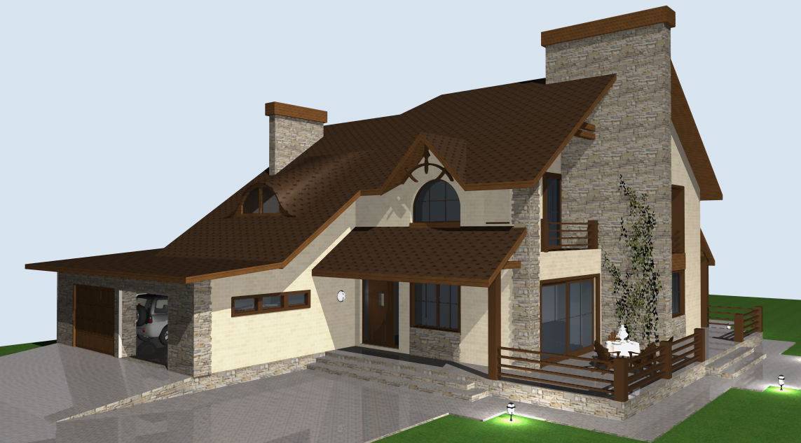 Проект двухэтажного дома с мансардой и гаражом на две машины