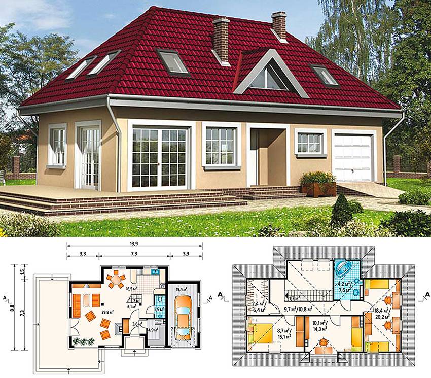 Для строения дома с мансардой и гаражом можно воспользоваться готовым проектом