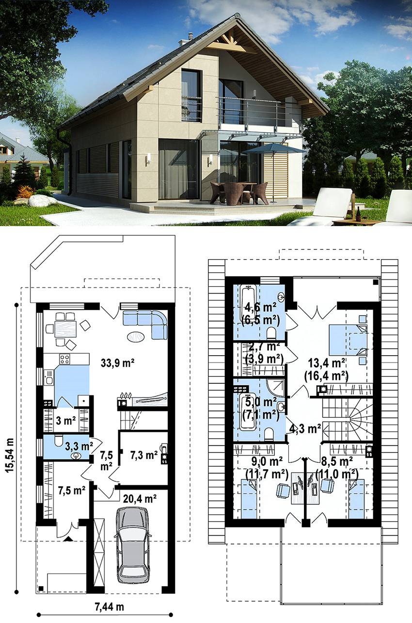 Если вы владелец внушительного автопарка, стоит присмотреться к проектам домов с мансардой, в которых нижний этаж полностью занят гаражным помещением, а жилые и подсобные помещения обустроены на верхних ярусах.