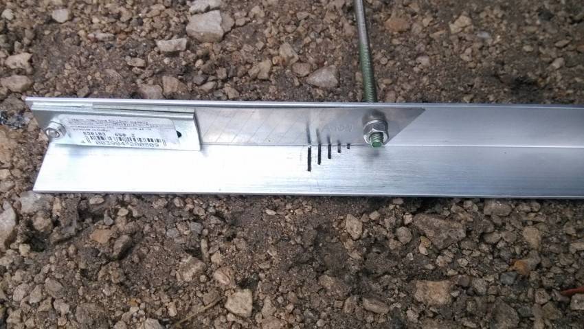 Сверху на один из болтов отверстием надеваем лезвие от канцелярского ножа и сверху надеваем еще по одной шайбе, затягиваем все гайками.