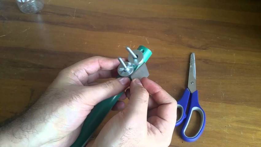 Другой вариант того, как сделать бутылкорез своими руками, менее распространён. Он изготавливается из подручных материалов, но процесс создания такого инструмента занимает больше времени и более трудоёмок. Преимущество такого изделия в том, что лента, изготовленная с его помощью, получается идеально ровная и подходит для изготовления поделок и украшений.