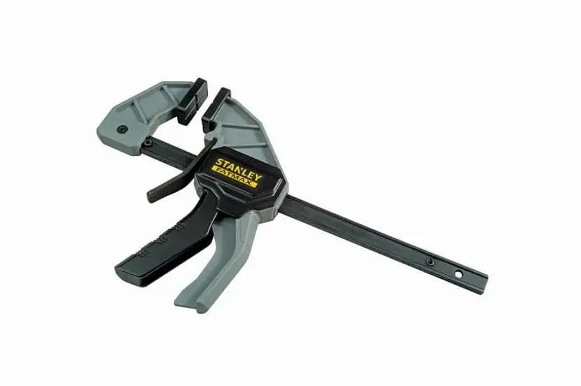 Находится в группе лидеров в рейтинге лучших струбцин быстрозажимного типа. Изготовлена из прочного пластика и стали, выполнена по пистолетному принципу. Триггерная модель предназначена для работ с заготовками, ширина которых достигает 300 мм.