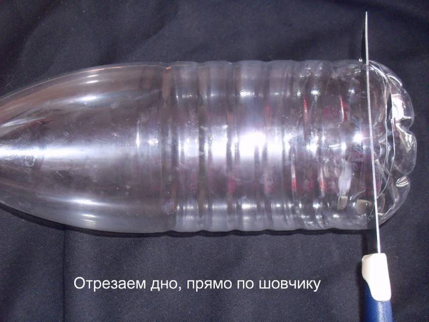 1. Острым ножом или ножницами отрезаем верхнюю часть пластиковой бутылки по кругу в том месте, где она начинает переходить в цилиндрическую форму (примерно 1/3 емкости по высоте).