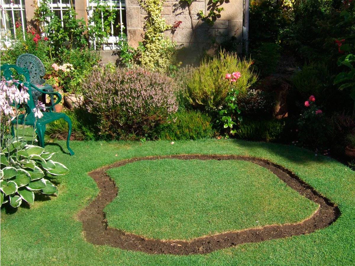 - Рисуют схему. Сначала план изображают на бумаге, затем прорисовывают на грунте. Переносят схему в натуральную величину с изгибами, «полочками» для растений, зонами углубления.