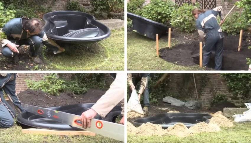 Важно! На дно пластиковых чаш нельзя укладывать плёнку. Это не столько поможет в герметизации, как усилит образование испарений, что приведёт к порче пруда.