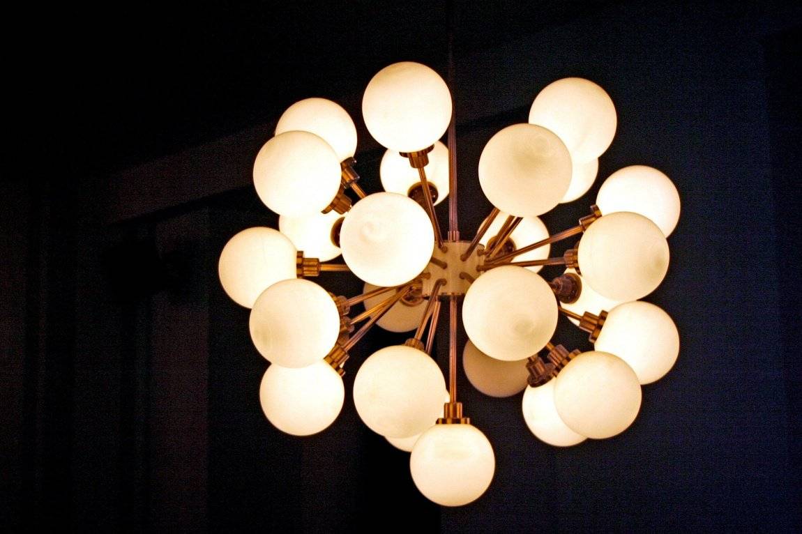 Если планируется устанавливать люстру, то сначала определяется, сколько м2 будет освещаться ей, затем рассчитывается количество точечных светильников. Например, в зале площадью 20 м2 планируется установка люстры с 6 лампами накаливания по 40 Вт каждая. Первым делом определяется, сколько м2 в соответствии с нормами осветит люстра (6 х 40 Вт / 22 Вт/м2 = 10,9 м2).