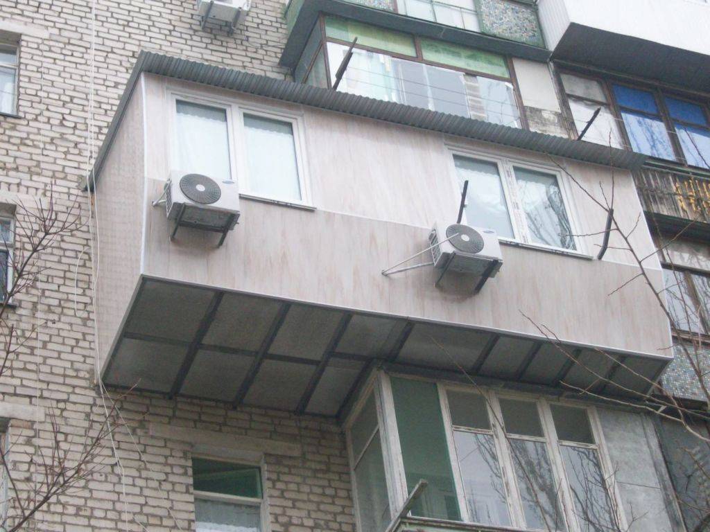 При значительном расширении лоджии по полу не обойтись без устройства крыши. Для этого металлокаркас наращивают на соответствующем уровне и обшивают выбранным материалом. Кровельный материал должен быть легким, чтобы не увеличилась нагрузка на несущие элементы. Подойдет профлист, ондулин.