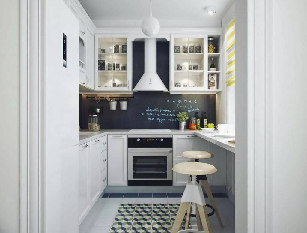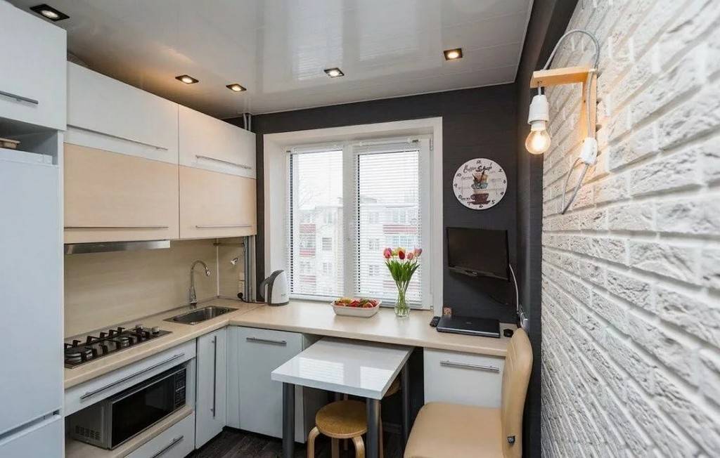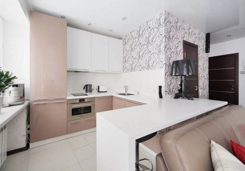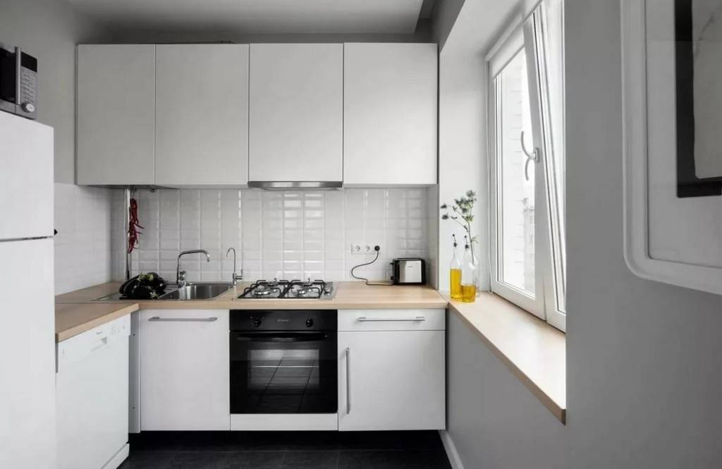 Не занимают места еще и двери-гармошки. Они удобны и долговечны, легко эксплуатируются и устанавливаются. Некоторые модели можно заказать индивидуально под арку. Для обустройства малогабаритной кухни используют Г-образную, линейную и реже угловую мебель. Последняя подходит даже для квадратных по форме помещений.