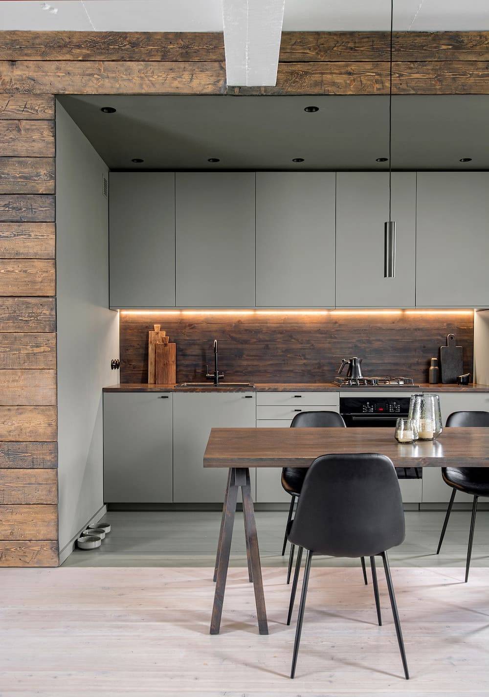 Тренды кухонь 2021 – 2022 часто представлены дизайнами в стиле модерн. Он практичный, функциональный, лаконичный. Он отличается от других контрастными цветами, строгими линиями, деревянной мебелью с металлическими, стеклянными деталями. Техника встроена в гарнитур, светильники — в потолок или мебель. Поверхности могут быть глянцевыми или матовыми.