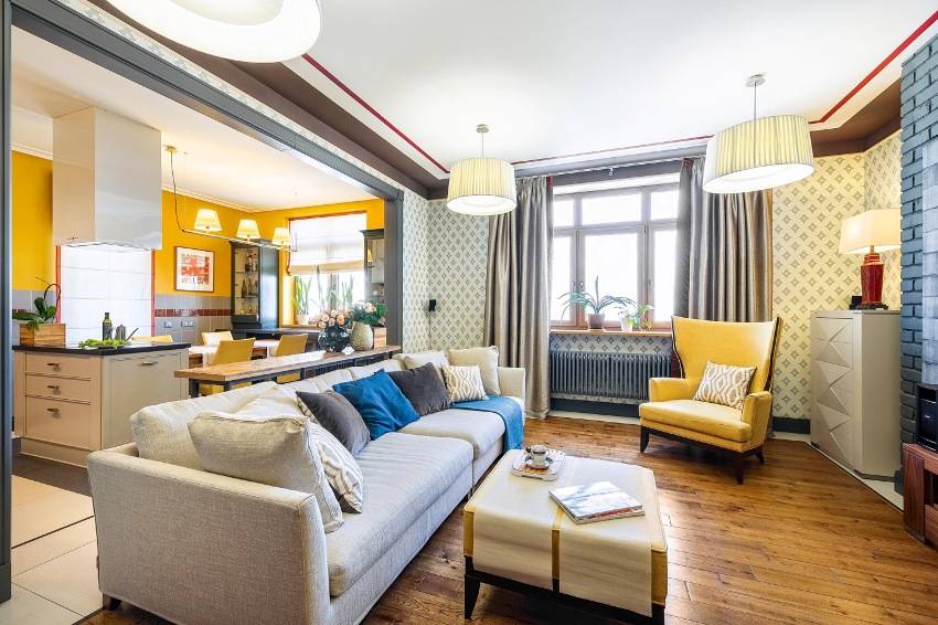Дизайн гостиной комнаты с совмещенной кухней