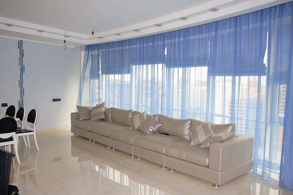 Светопрозрачный тюль имеет место в сочетании с римской шторой