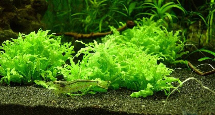 Наиболее выносливая трава — валлиснерия. Она без проблем приживается, быстро разрастается, неприхотлива в уходе. Тоненькие длинные салатовые листочки валлиснерии прекрасно задрапируют заднюю стену резервуара. Для средней части хороши людвигия ползучая, бакопа, роталла. Можно поставить и коряжку с яванским мхом.